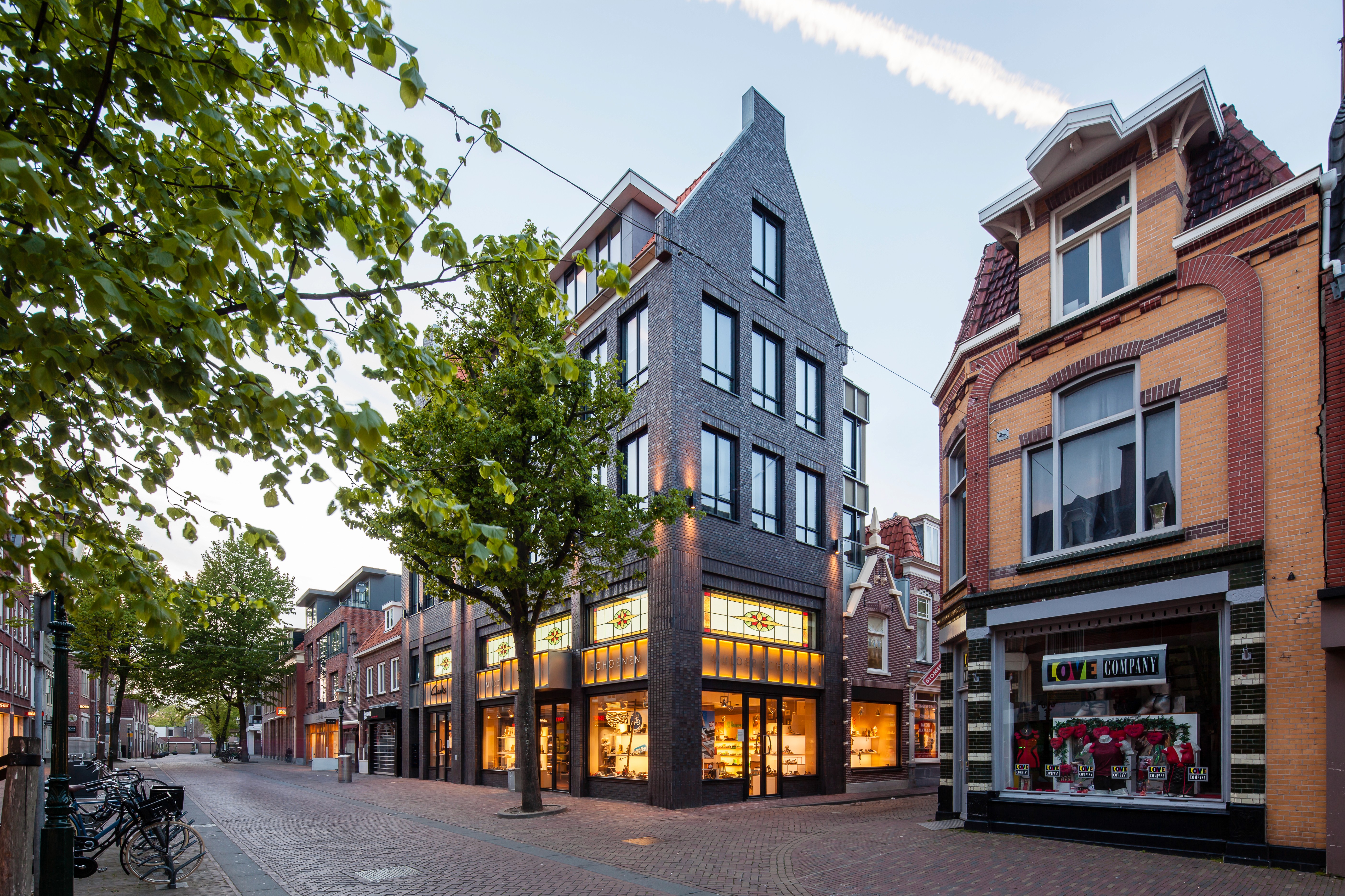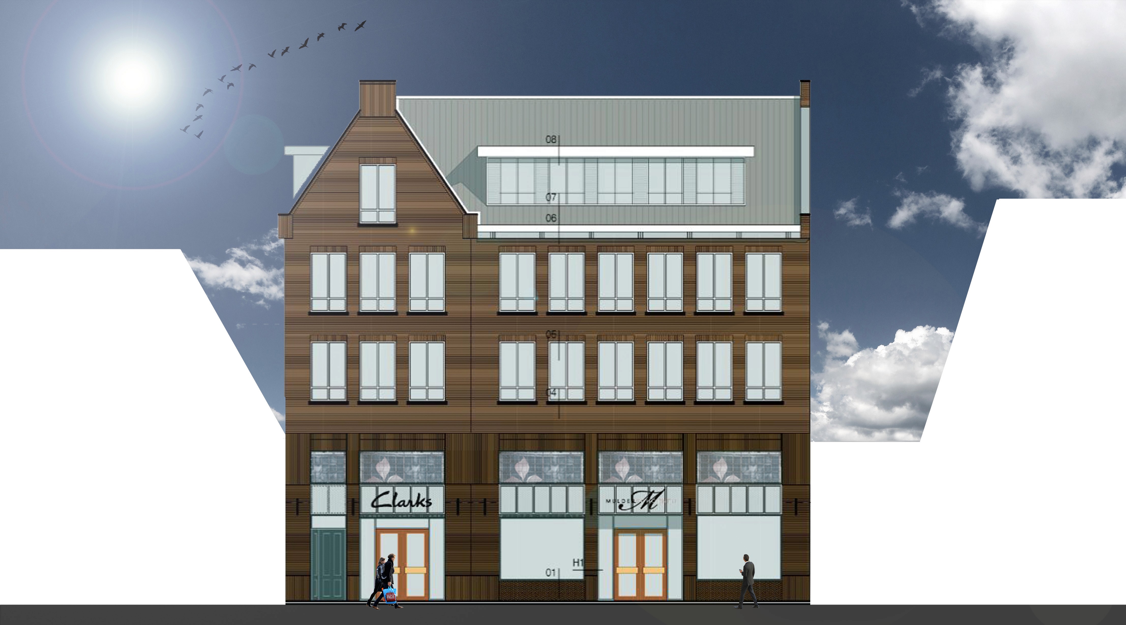Als hoekpand is het gebouw dominant in het straatbeeld aanwezig. De traditionele vorm en uitvoering in baksteen geven het gebouw een uitstraling die past in de context van de oude binnenstad. Goot- en nokhoogten en de traditionele kapvorm reageren op de directe omgeving. Ook de opbouw met een plint, tussenlaag en kap is klassiek. Door de tussenverdieping (t.b.v. het magazijn) in de plint op te nemen kon er een voorname onderpui worden gecreëerd, die in verhouding staat tot schaal en situering van het gebouw. Een klassieke oplossing die al vele honderden jaren in binnensteden wordt toegepast en hier op moderne wijze is vormgegeven. De plint is opgetrokken in staand metselwerk van lang gevormde, door het bakproces rijk genuanceerde, donkere klinkers. De gevelinvulling bestaat uit rank geprofileerde metalen puien met twee bovenliggende kaders als naamdragers en ledschermen. Waar vroeger glas in lood vorm gaf aan de uitstraling van de winkel is dat hier vertaald in ledschermen – glas in led–. In de woonlagen is het metselwerk voortgezet in een wild verband, met rollagen boven de ramen. (Bron: www.kdra.nl)